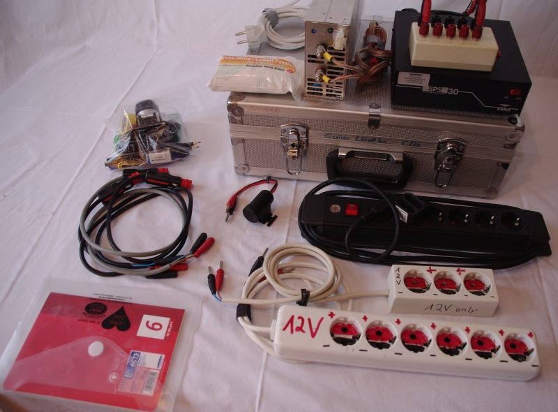 In insgesamt zwei Koffern findet man alles notwendige, was man benötigt um die Funkgeräte und Zubehör an 230V (über Netzteile), 12 Volt aus Batterien und 12 Volt im Auto betreiben zu können: Kabel, Adapter, Verteiler, Netzgeräte, Inverter usw. Dieser Koffer wird voraussichtlich benötigt, wenn eine Funkzentrale (siehe Einsatzkonzepte) errichtet und betrieben werden soll.