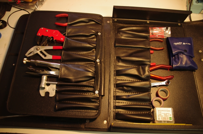 Natürlich musste ein Satz Werkzeuge her. Dinge wie Schraubendreher, Zangen, Isolierband, Steckschlüssel, Strommessgerät und ähnliches sind unverzichtbar für jeden Funkamateur - und für einen Notfunker erst recht. Damit reiht sich auch dieser Koffer ein in die zuvor beschriebenen "Service-Koffer" und gehört somit auf den Handwagen oder in den Kofferraum desjenigen, welcher dafür sorgt, das seine Funkstationen beriebsbereit bleiben können.