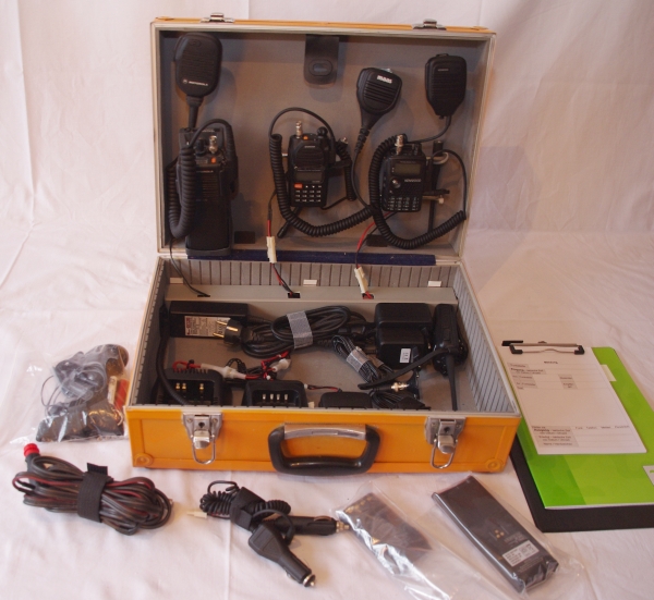 Das Bild rechts zeigt die erste Version des Handfunkgerätekoffers - noch mit weniger Geräten ausgestattet. Das abgebildete