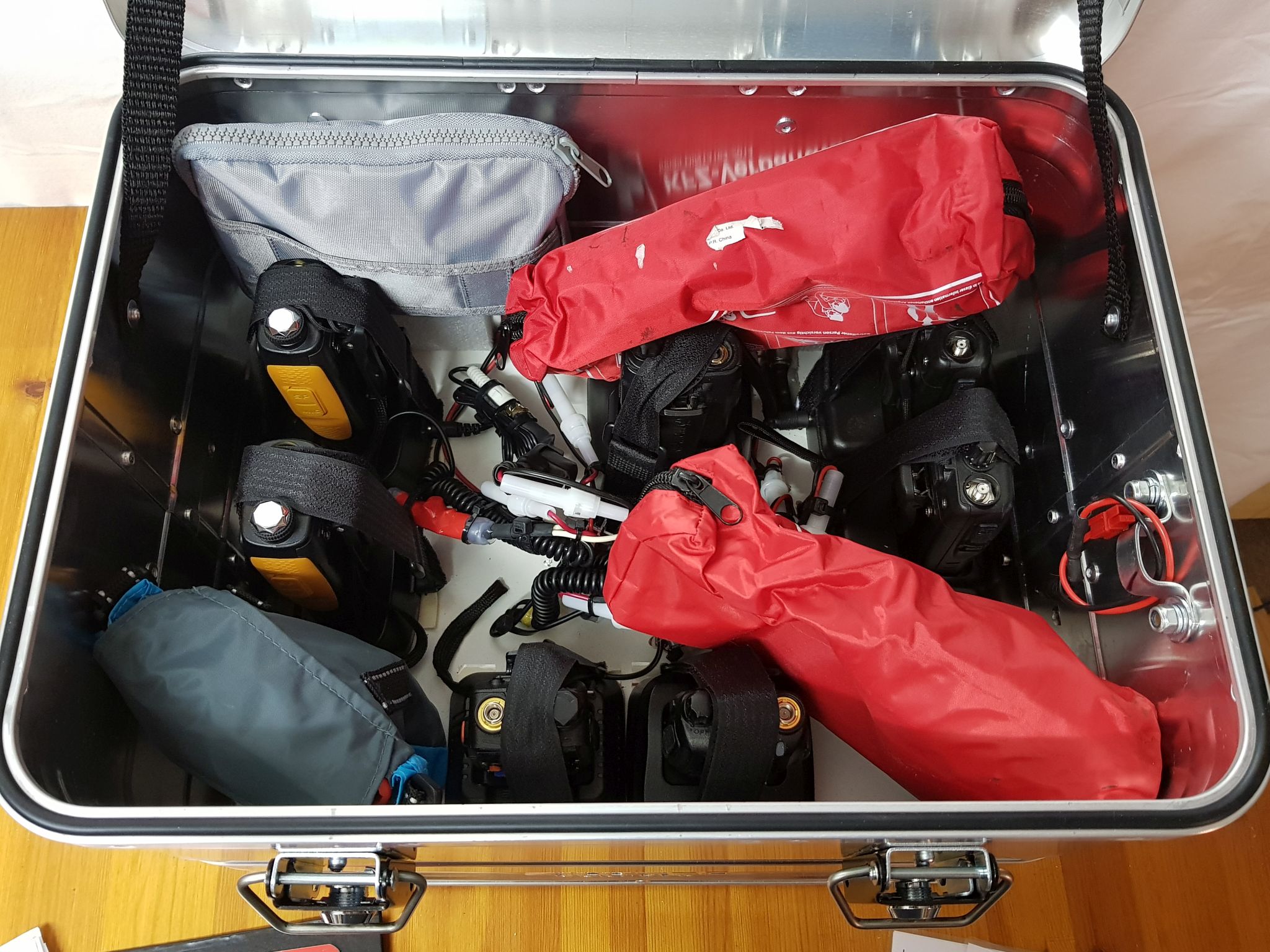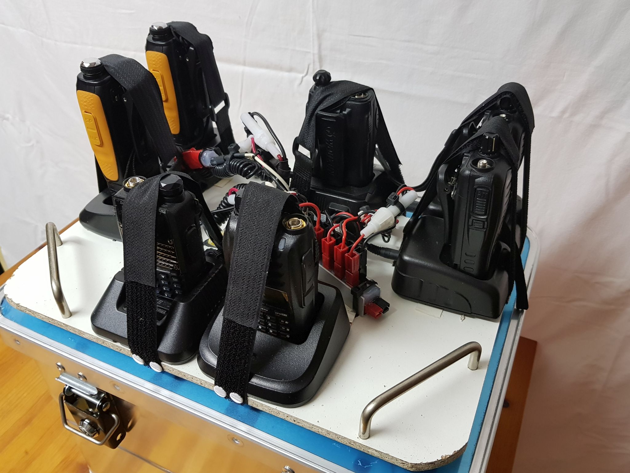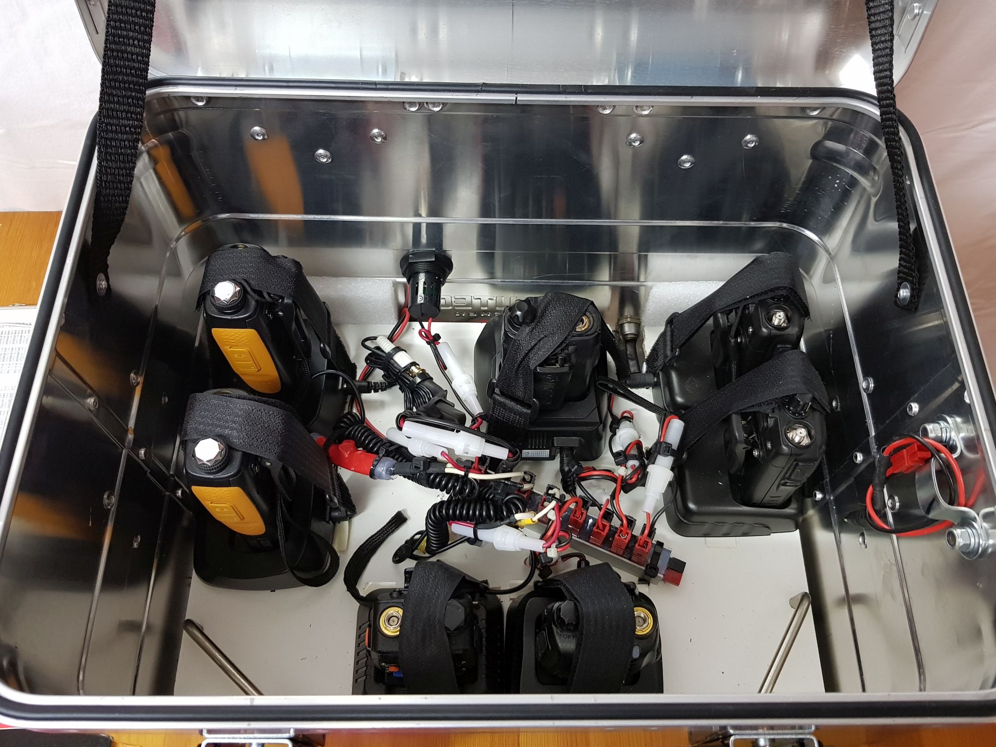 Alle ständig im Koffer befindlichen Handfunkgeräte sind leider nur über einen Standlader zu laden - was die Sache natürlich