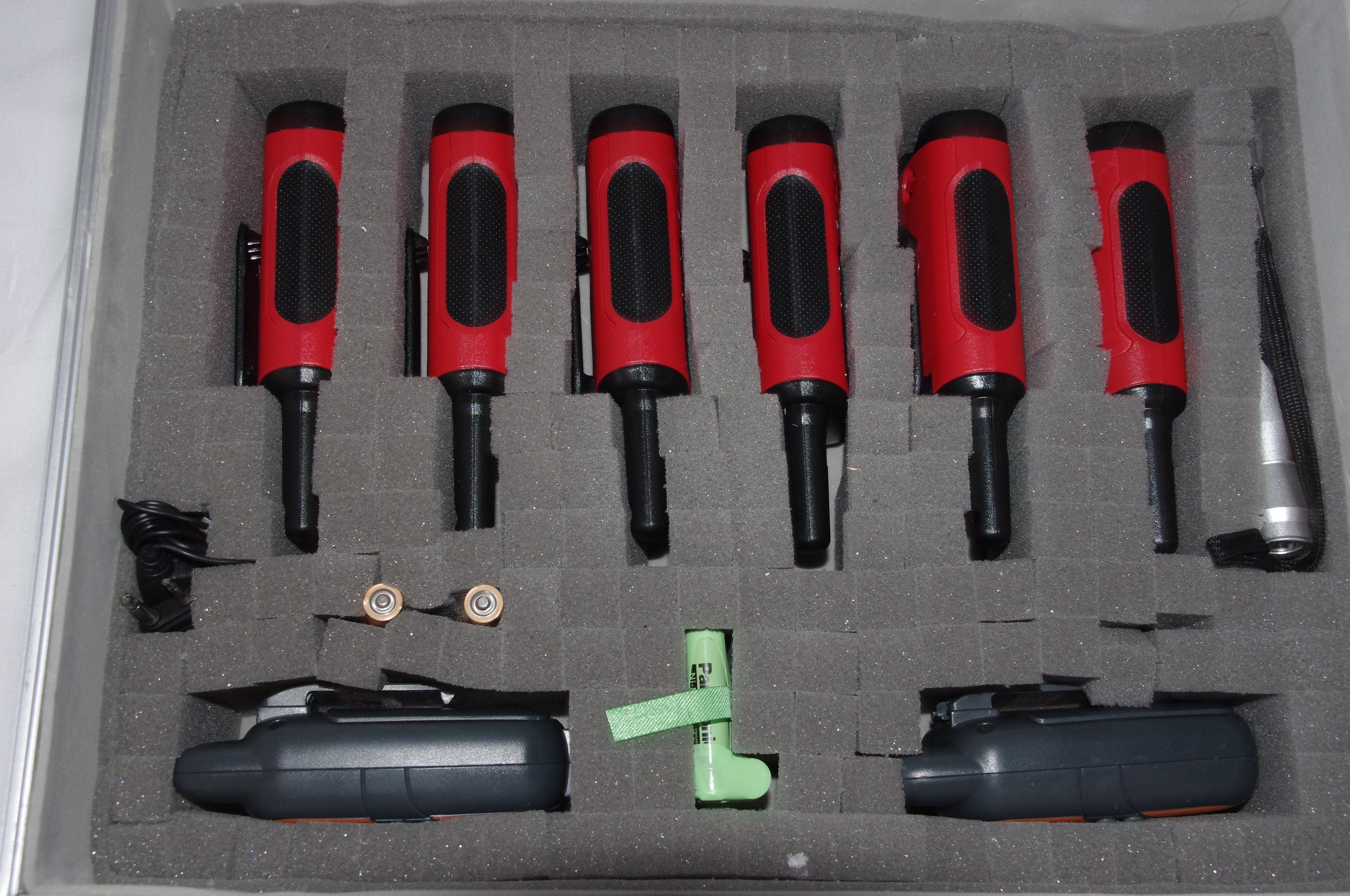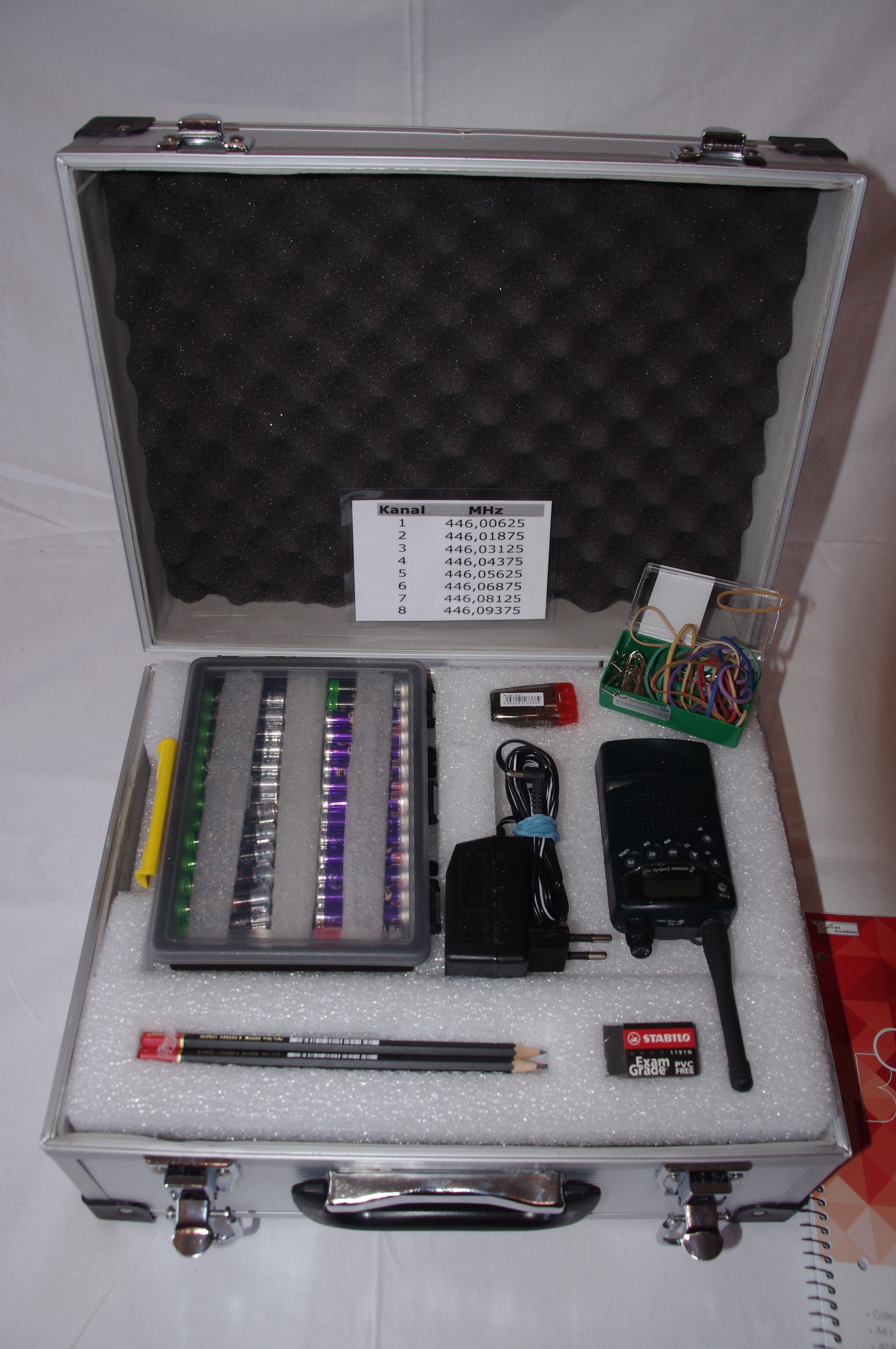 Auf dem letzten Photo sieht man alle Innereien noch einmal ausgepackt. Die Handfunkgeräte müssen nur mit Batterien bestückt