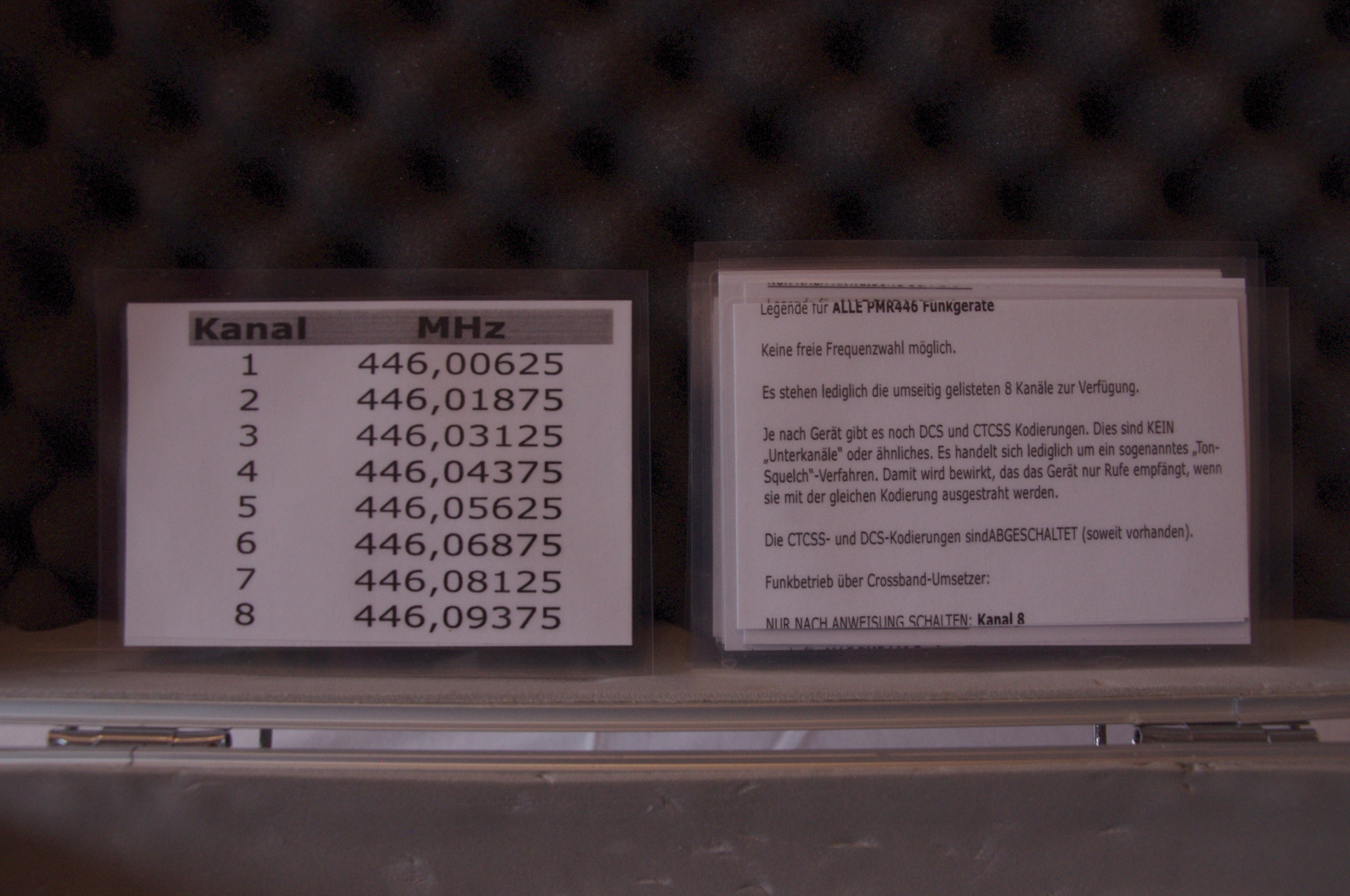 Für jedes Gerät liegt eine kleine laminierte Karte anbei. Auf der einen Seite sind die PMR-446-Frequenzen der Geräte und die