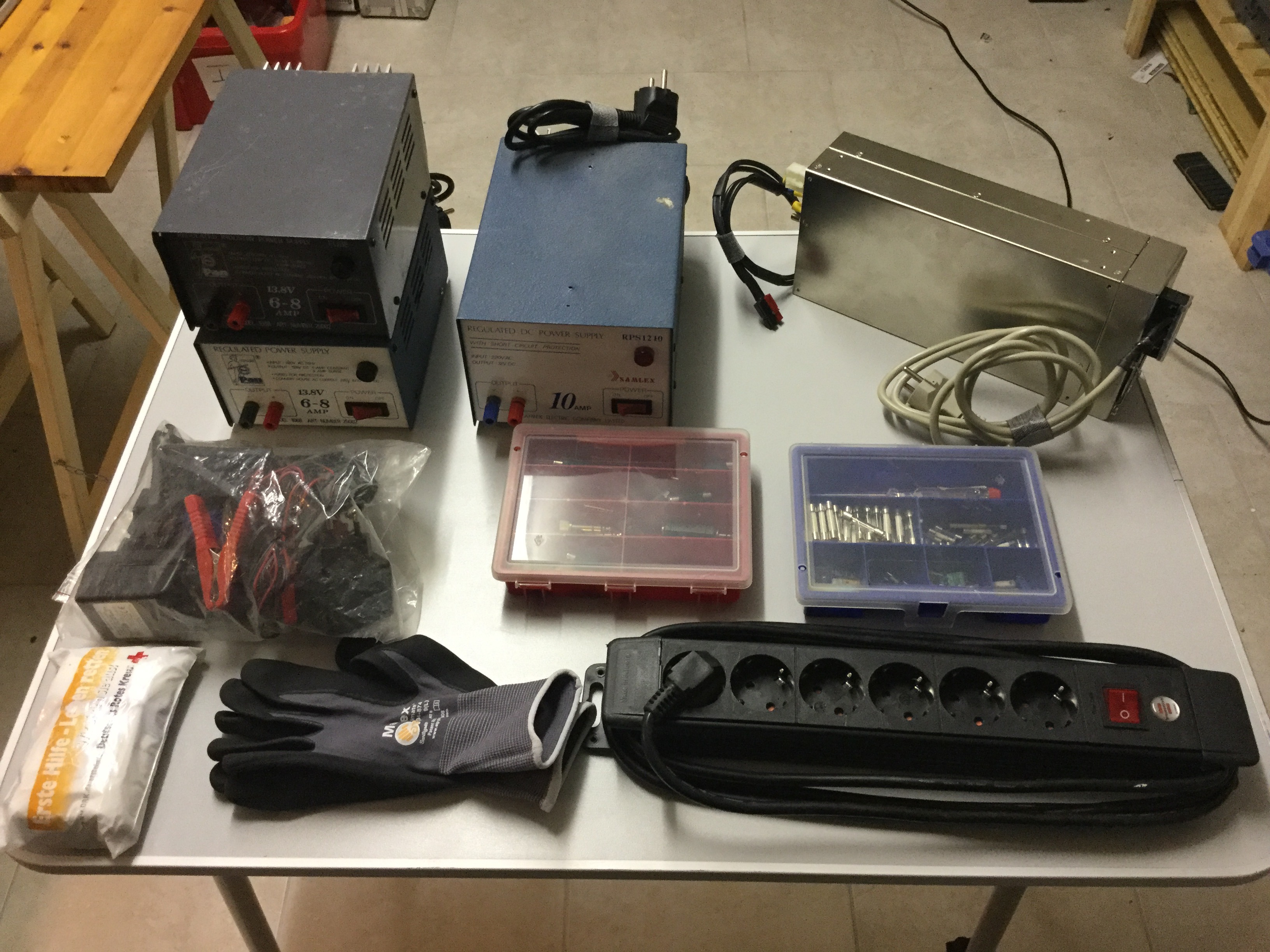 Das Thema "Stromversorgung" war natürlich von Anfang ein Teil meiner Projektplanung. Nach dem das Material aber inzwischen drei Koffer unterschiedlicher Größen füllte, habe ich das alles etwas kompaktiert, zusammengefasst und thematisch geordnet. Koffer S1 enthält alles, um Geräte antweder an einem KFZ-Bordnetz oder mit tragbaren Batterien betreiben zu können.Koffer S2 wiederum wird benötigt, wenn noch ein 230V-Wechselspannungsnetz zur Verfügung steht und somit keine Batterien zum Einsatz kommen. Dabei ist Koffer S2 die Ergänzung für Koffer S1, welcher immer zum Einsatz kommt.