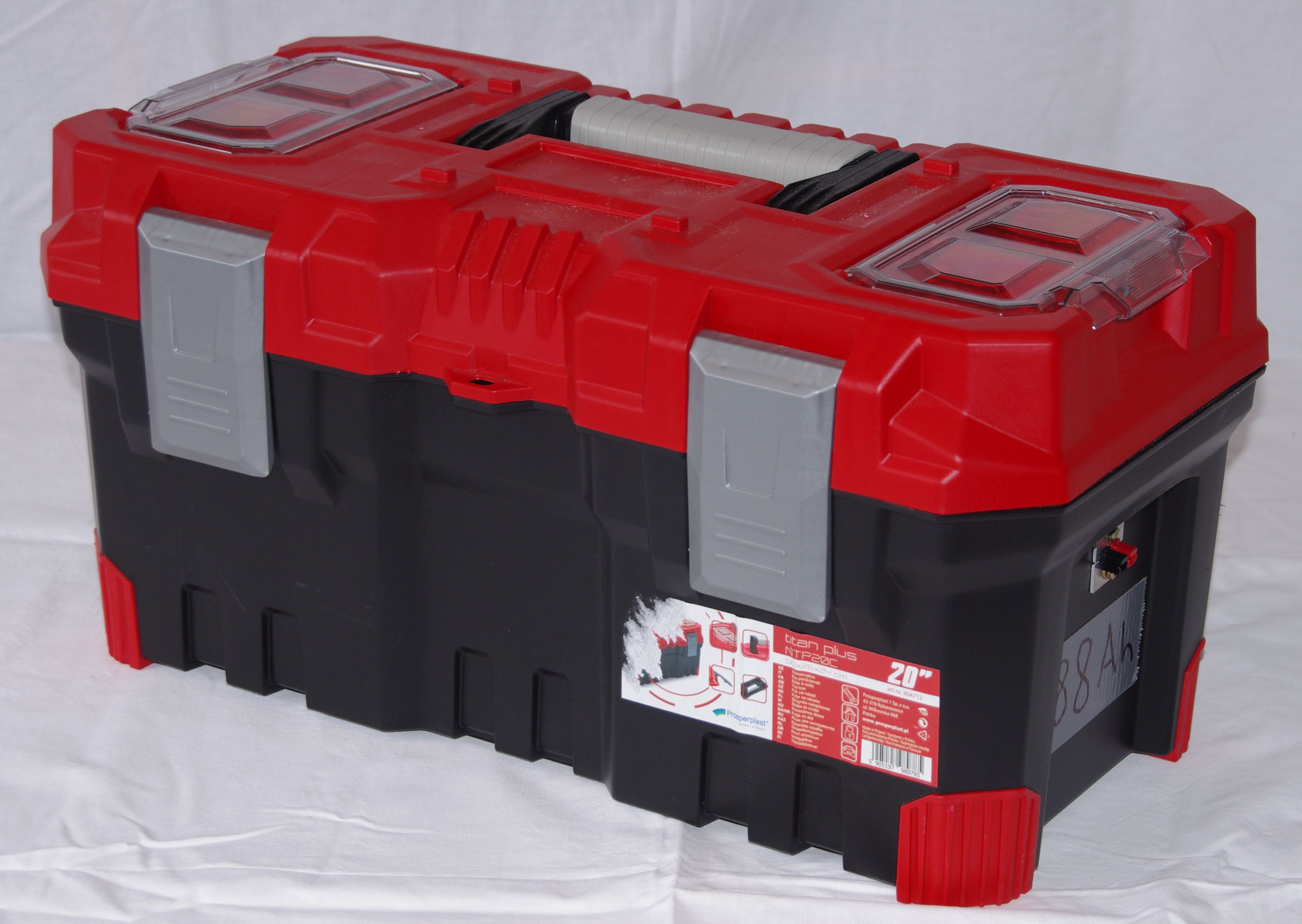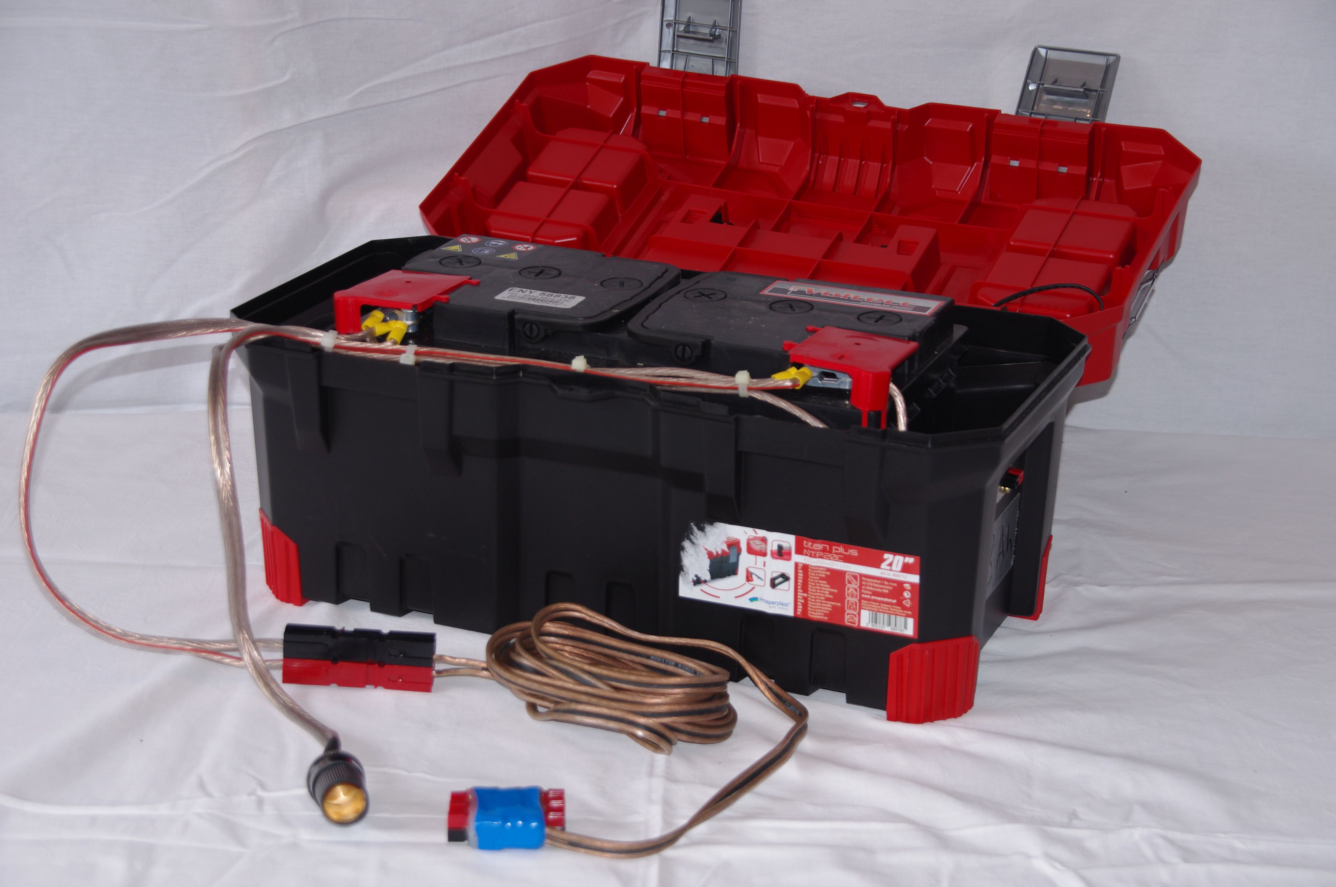 unterzubringen. Nach der Zerstörung mehrerer anderer Behältnisse, fiel meine Wahl auf diesen handlichen Baumarkt-Werkzeugkoffer.KFZ-Akkus sind im Übrigen auch ein Kompromiss aus Kapazität und Preis. Entgegen anderer Darstellung sind dieser aber durchaus für sehr viele Ladezyklen geeignet. Im heimischen Auto wird der Akku schliesslich auch immer wieder nachgeladen - manchmal sogar mehrmals am Tag.